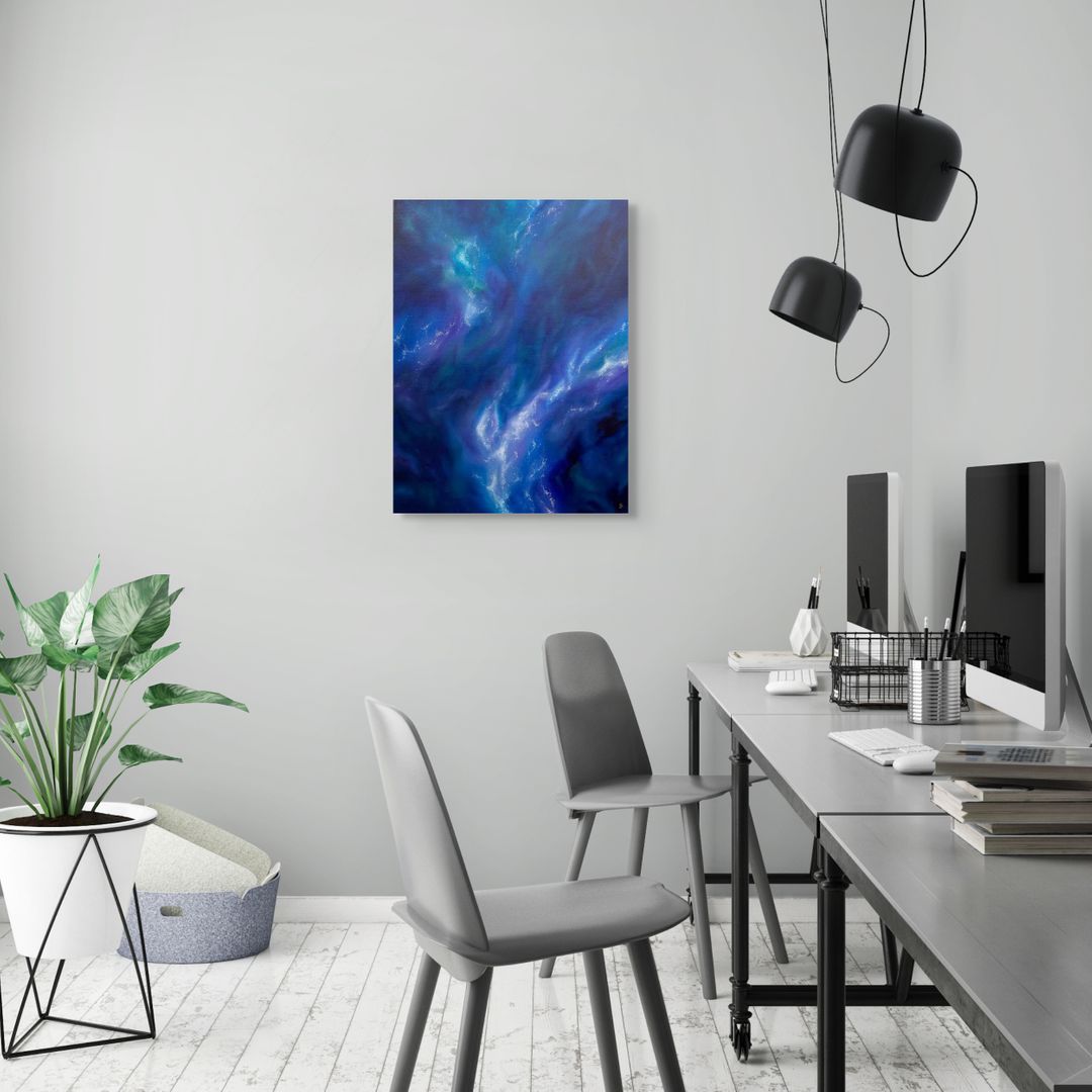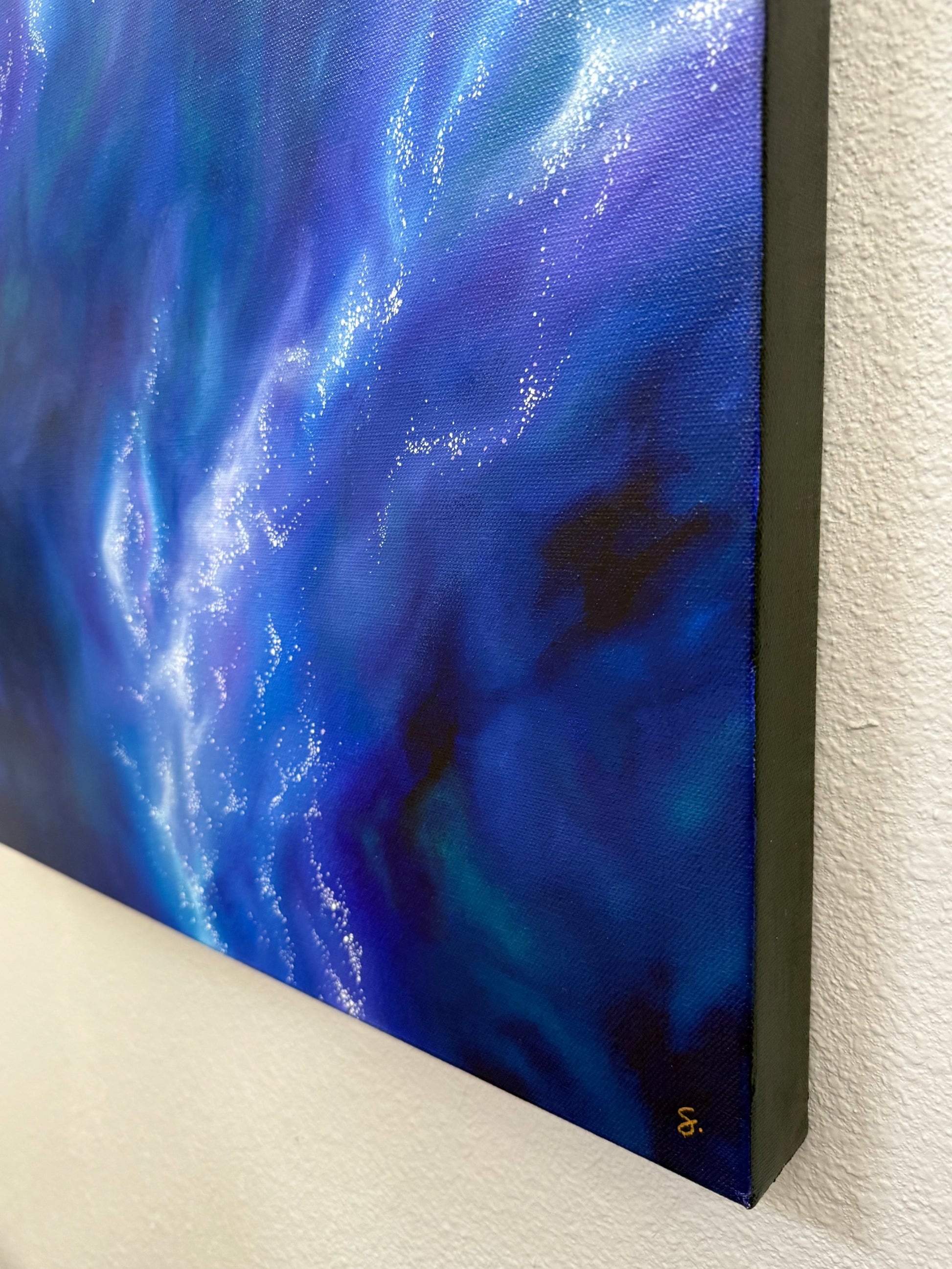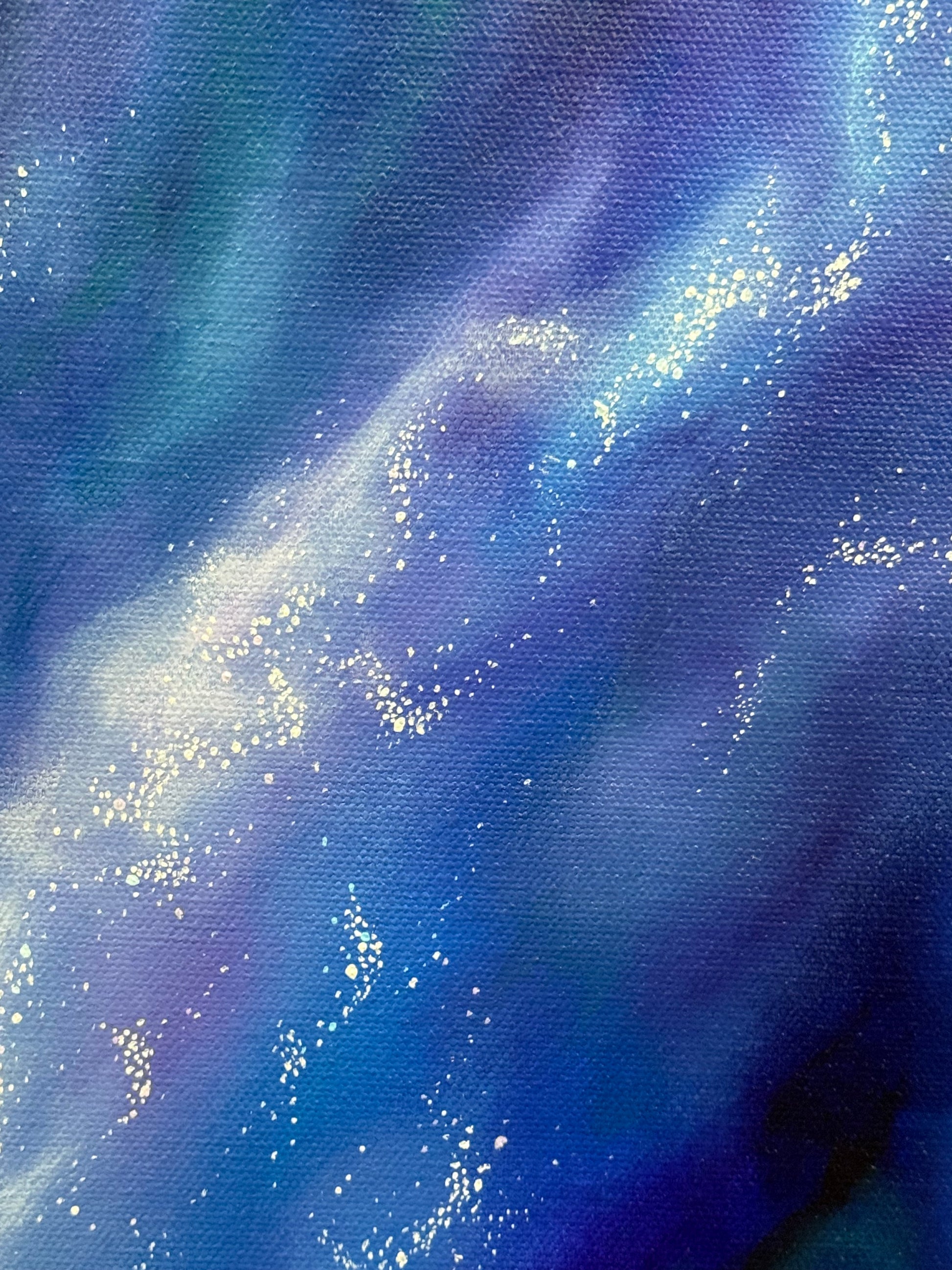 A World Away is an abstract exploration of distance and connection, rendered in a soothing range of blues that shift from deep navy to soft turquoise. The composition moves fluidly across the canvas, where wisps of pale blue and luminous white weave together to create a sense of gentle motion and layered depth. Scattered white speckles punctuate the surface like distant stars or glowing particles, lending the piece a quiet, almost mystical energy that invites viewers to lose themselves within its tranquil atmosphere.