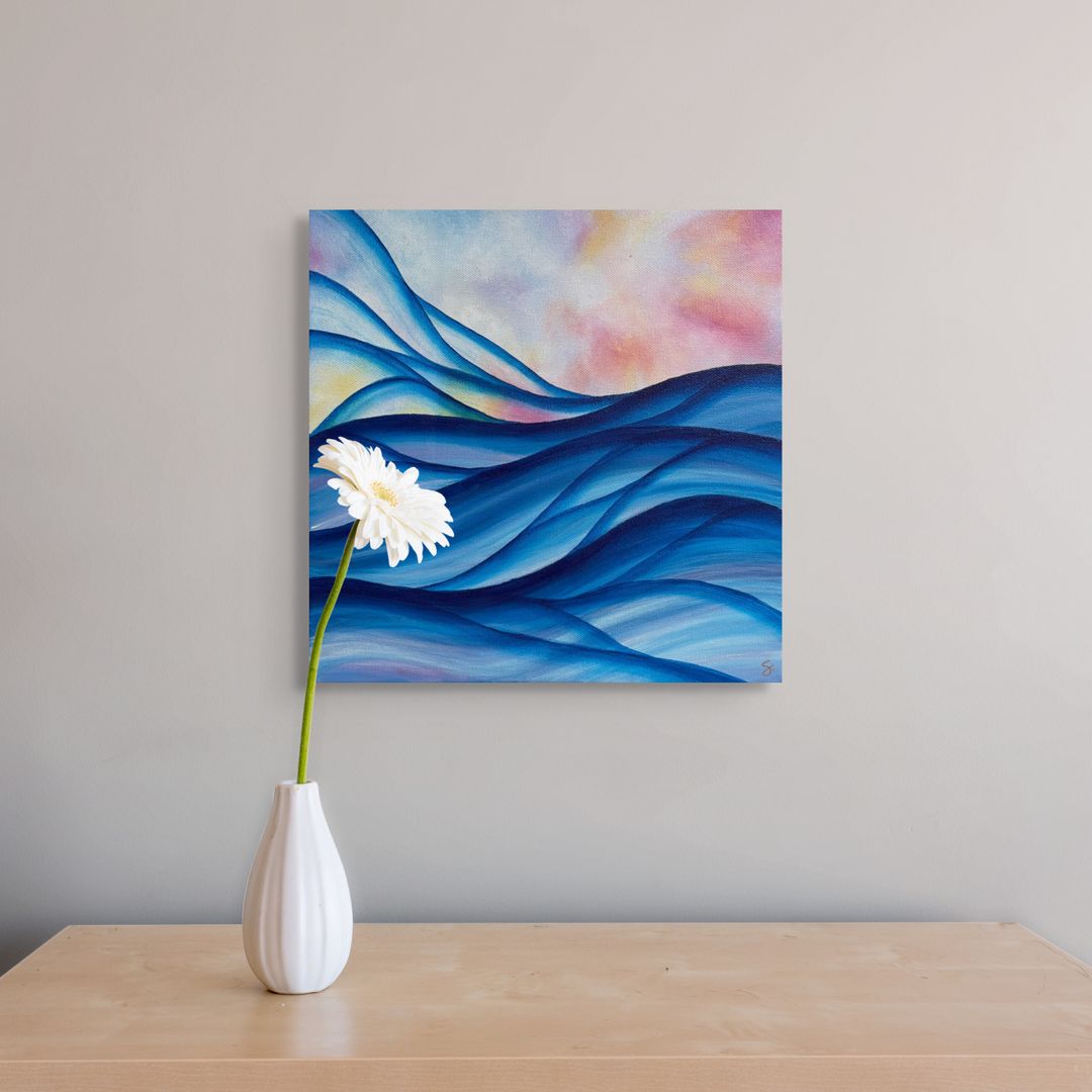 Changing Tides presents a fluid interplay of form and color that draws the viewer into a serene, shifting environment. Flowing wave-like shapes in deep and lighter blues ripple across the canvas, suggesting movement and the gentle power of water. These curves are balanced by a softly blended background of pastel pinks, yellows, and oranges, reminiscent of the sky during sunrise or sunset. The contrast between the cool, dynamic blues and the warm, tranquil backdrop creates a subtle harmony, evoking both the natural world and an otherworldly atmosphere. The smooth gradients and abstract shapes invite quiet reflection on change and transition, capturing moments of calm within constant motion. This piece blends emotion and imagination to explore themes of fluidity and transformation.