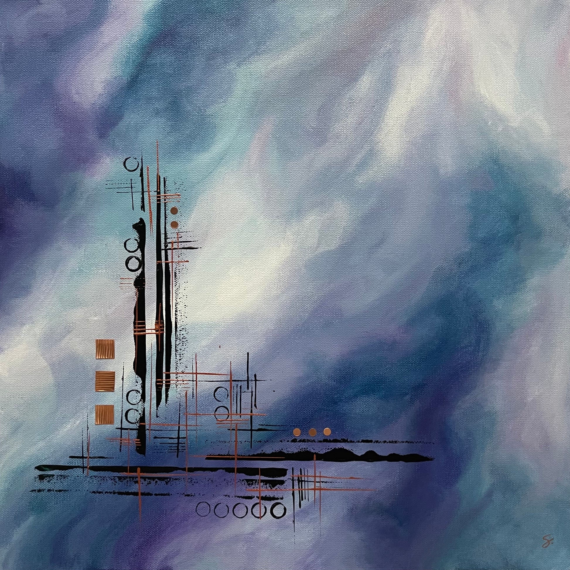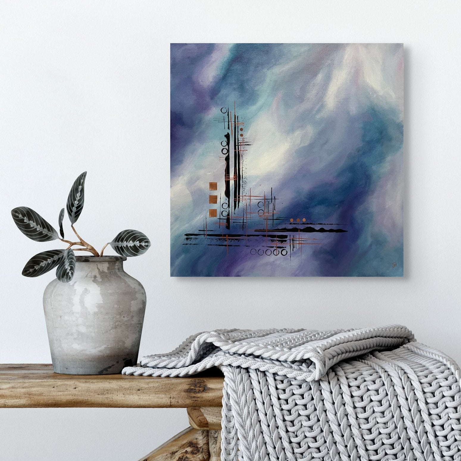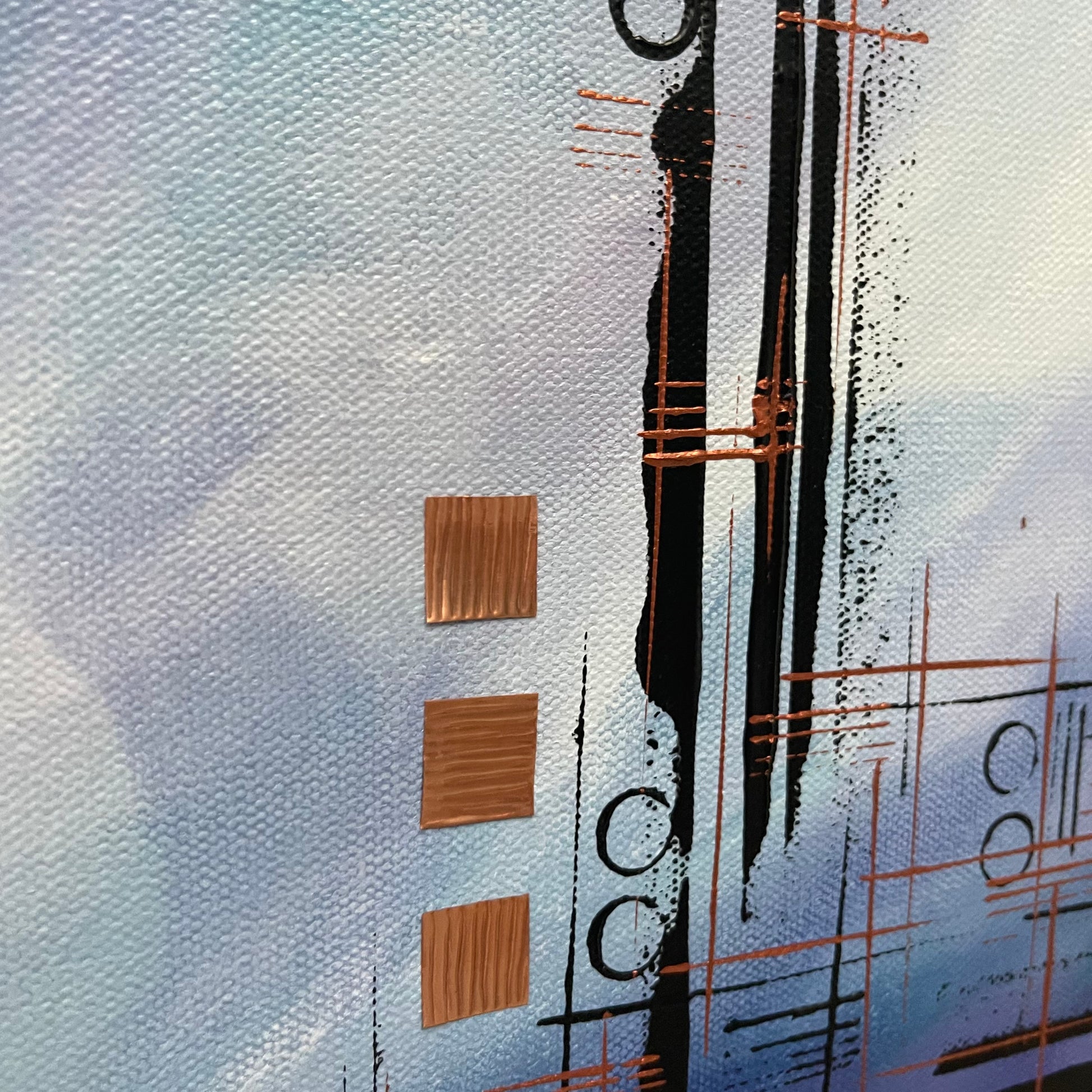 With its swirling blue and purple hues evoking a stormy sky, this captivating artwork invites you to become the curator of an abstract world where organic forms collide beautifully with structured geometric shapes. Your eye is drawn to intersecting black lines that spotlight intricate circular motifs and grid-like structures, intricately layered to create a mesmerizing depth. The addition of textured copper squares and dots introduces a striking contrast, adding not just visual but also tactile interest that makes you, the owner, the steward of an ever-unfolding narrative. Each glance uncovers new layers and complexities, offering a rich, sensory experience that continually captivates and inspires. By choosing "Dawn," you will bring a dynamic, multi-dimensional work of art into your life, inviting endless exploration and admiration.
