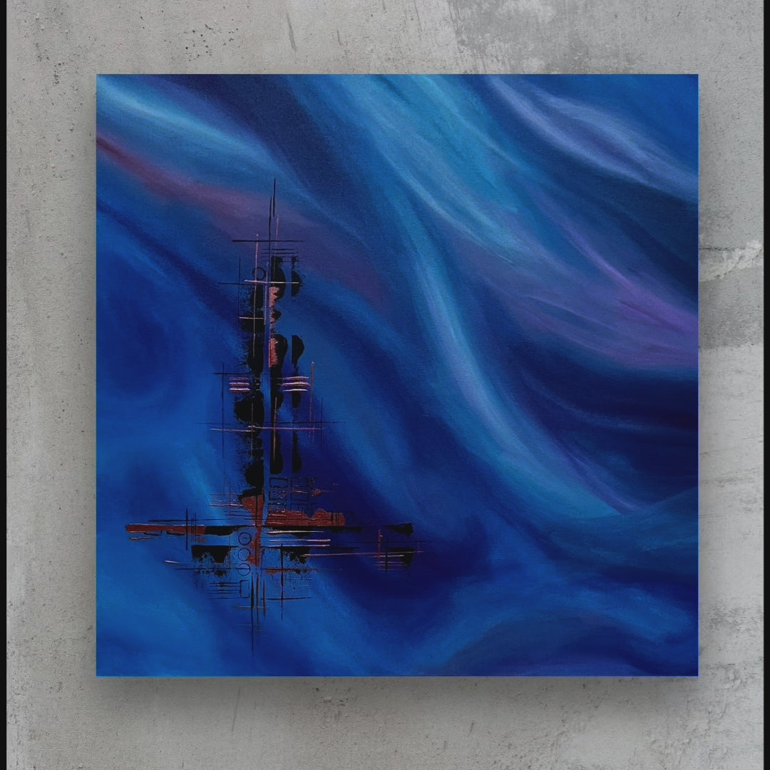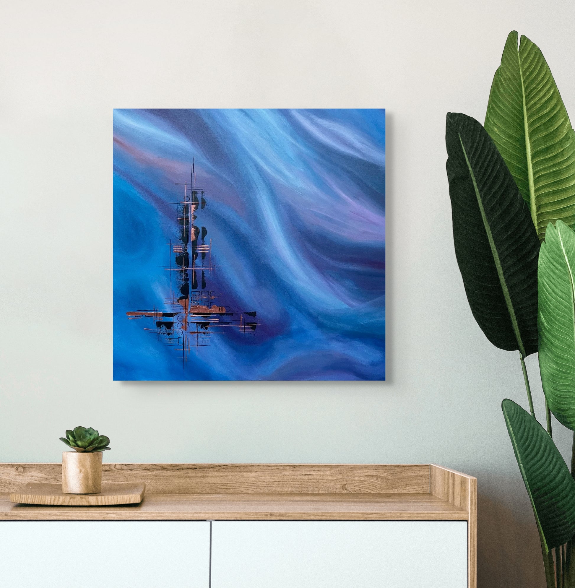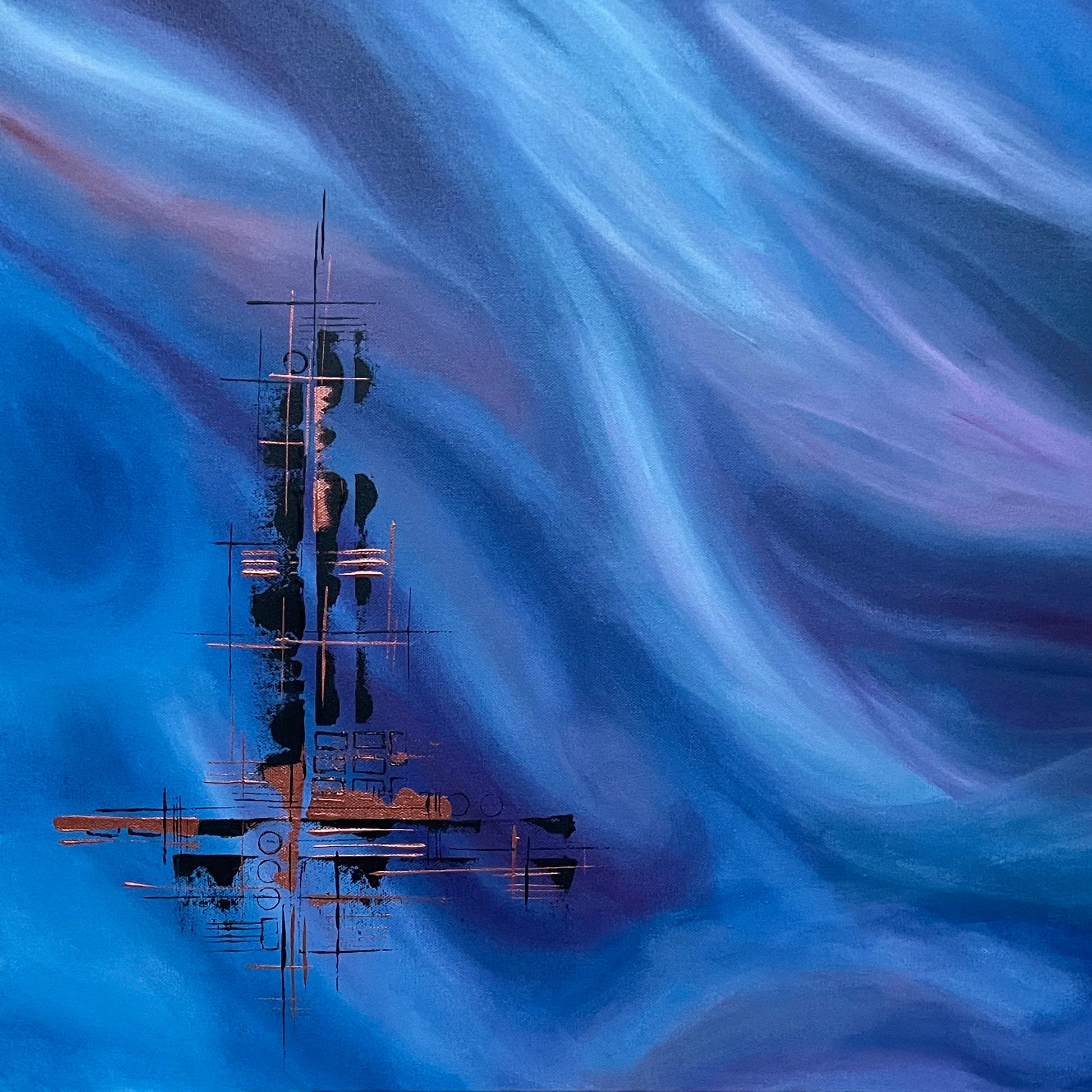 This artwork boasts an abstract style, portraying a complex, futuristic structure with geometric shapes and lines as its central subject. The color palette features captivating shades of black, dark blue, copper, and delicate hints of white, meticulously accentuating the intricate details of the piece. Set against a vibrant background of swirling blues and purples, the central figure commands attention with its rigid, yet captivating form, creating a mesmerizing interplay between structure and fluidity. The dynamic, wave-like pattern of the background implies movement and captures the imagination with its graceful allure.