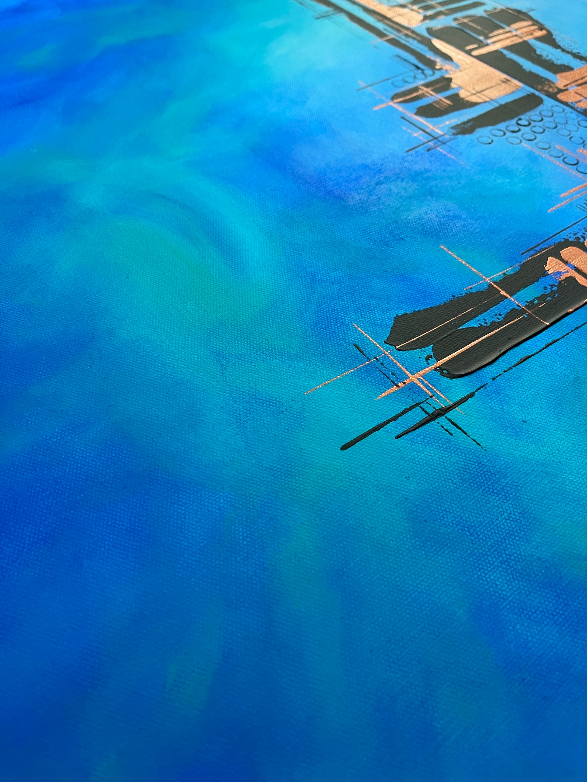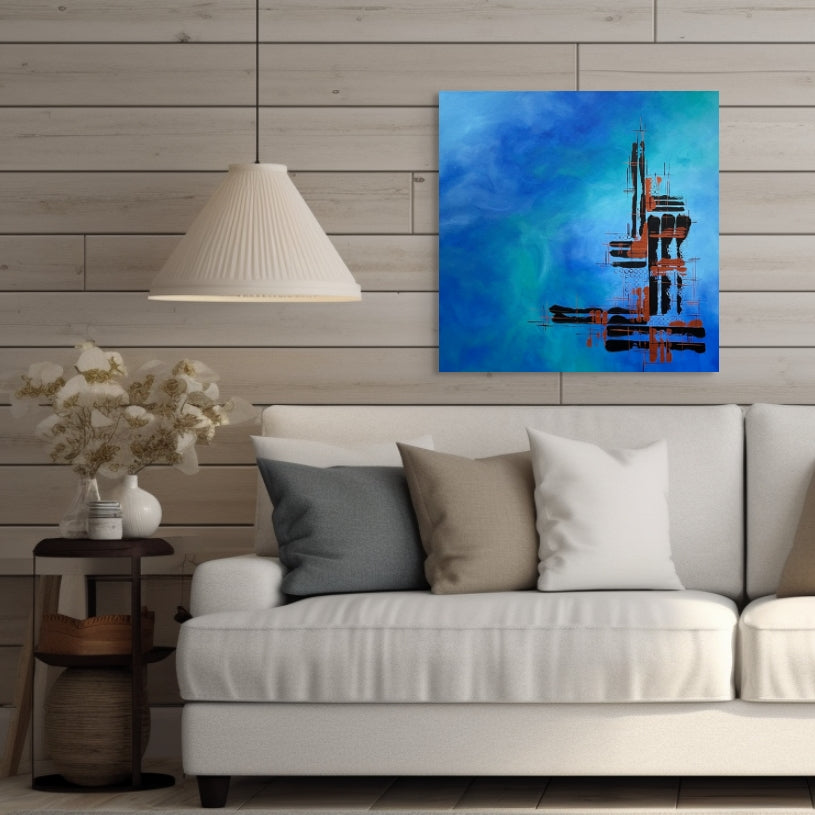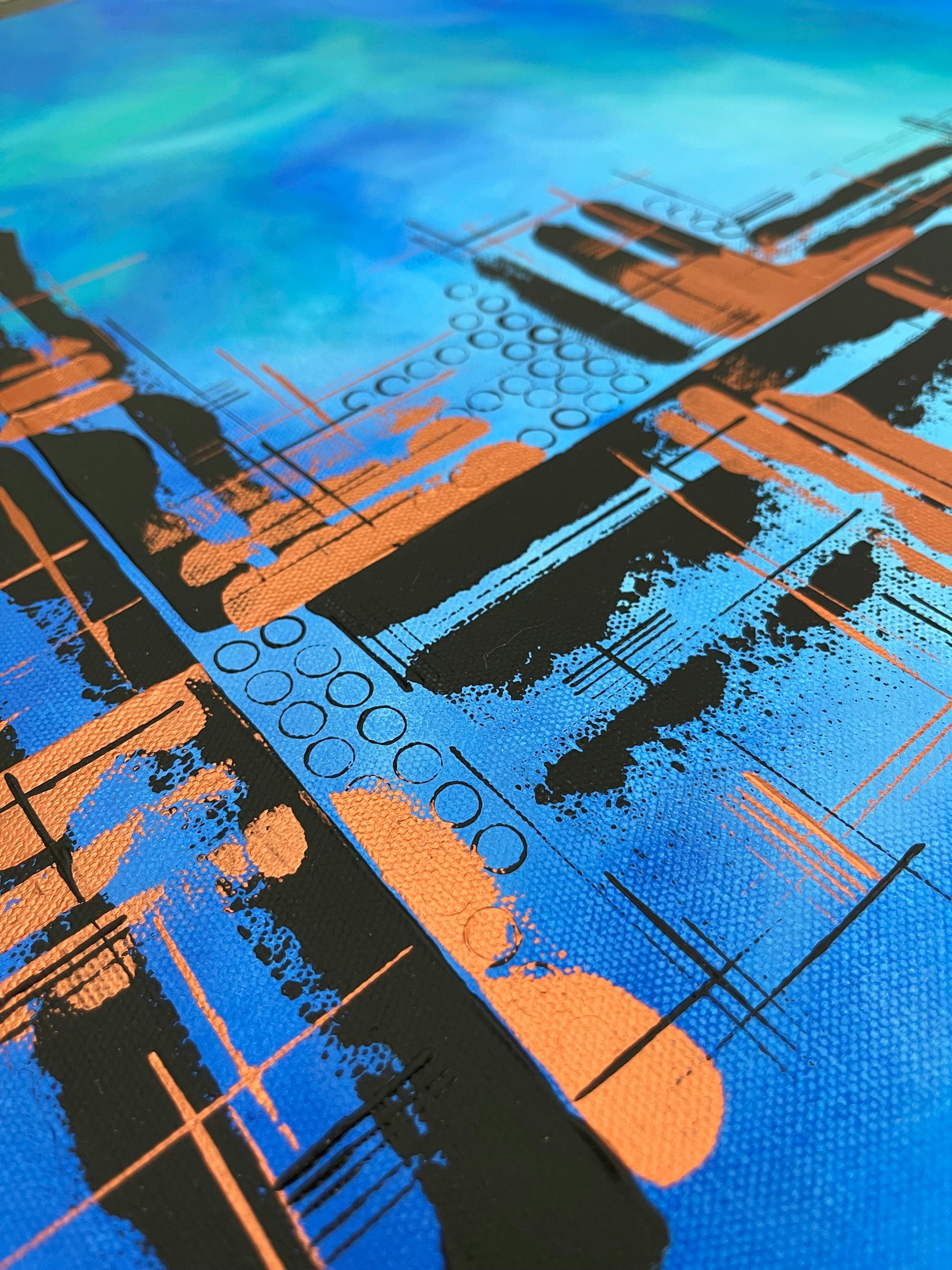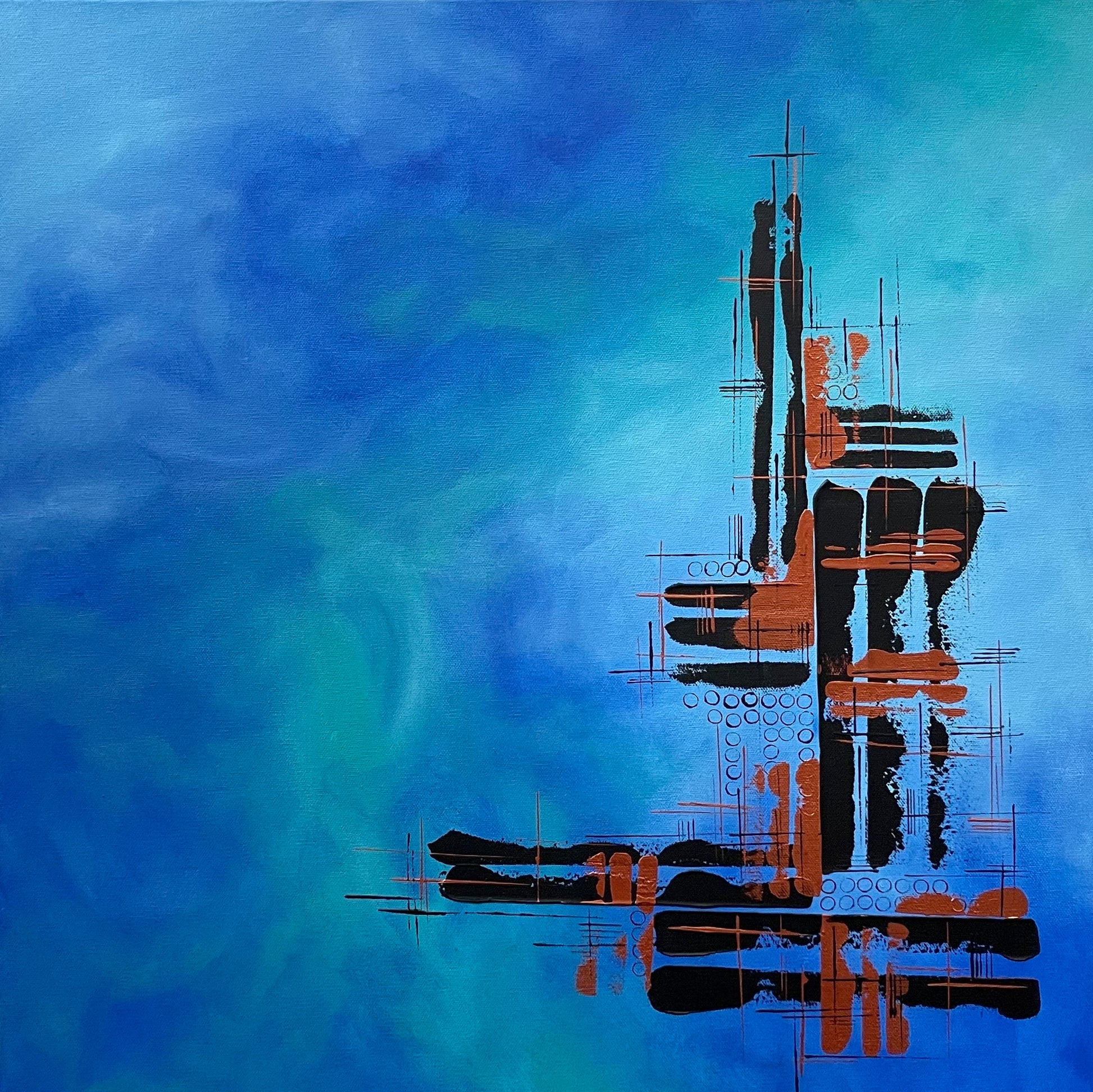 "Memories" is a breathtaking 24" x 24" acrylic painting that captivates the viewer with its abstract, geometric composition. Against a backdrop of swirling, blue tones that evoke the imagery of a sky or a body of water, the artwork features a collection of vertical and horizontal lines, as well as spots and clusters of a smaller circular motif. Rendered in shades of black and copper or bronze, these elements create a stark contrast with the cool blue background, adding to the dynamic and visually stimulating nature of the piece. The juxtaposition of the organic, sweeping background with the structured and precise foreground elements reflects my personal style, which often explores the balance and tension between chaos and order, complexity and simplicity. The artwork's abstract nature invites the viewer to meditate on these themes, making it a thought-provoking and engaging piece.