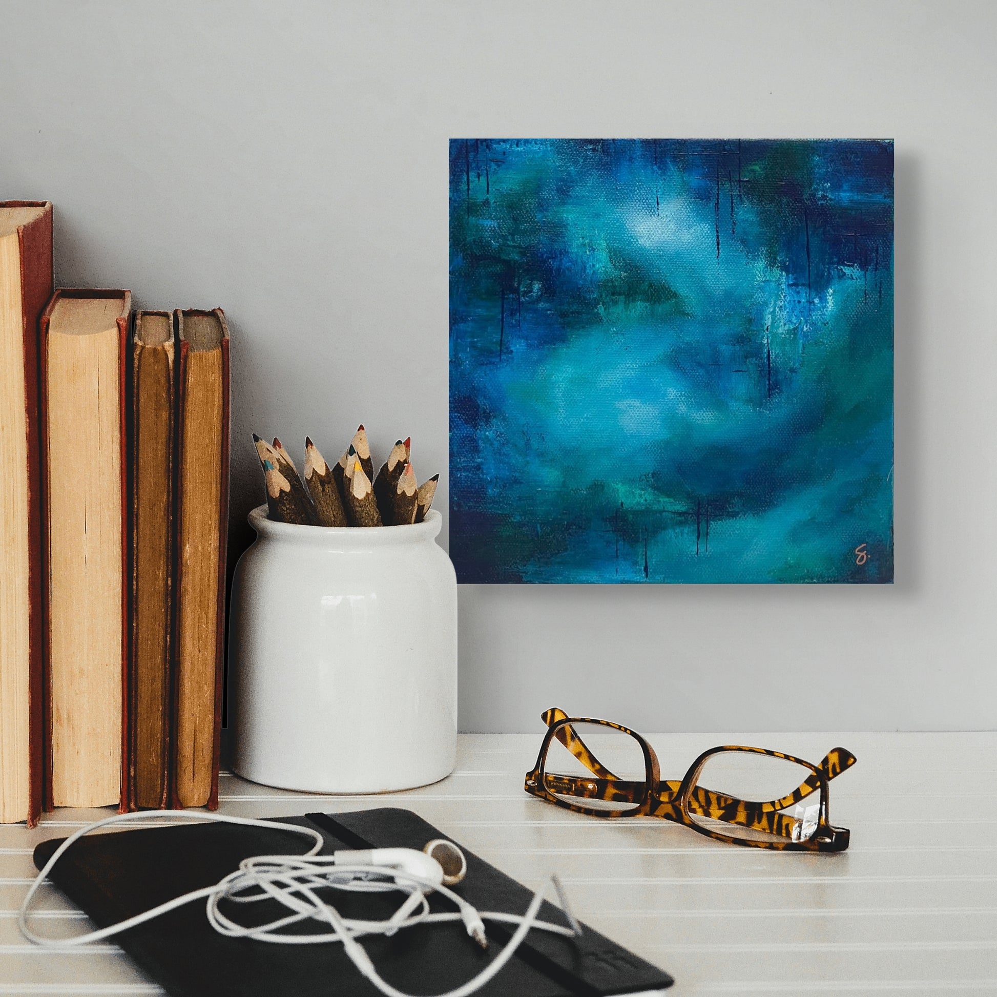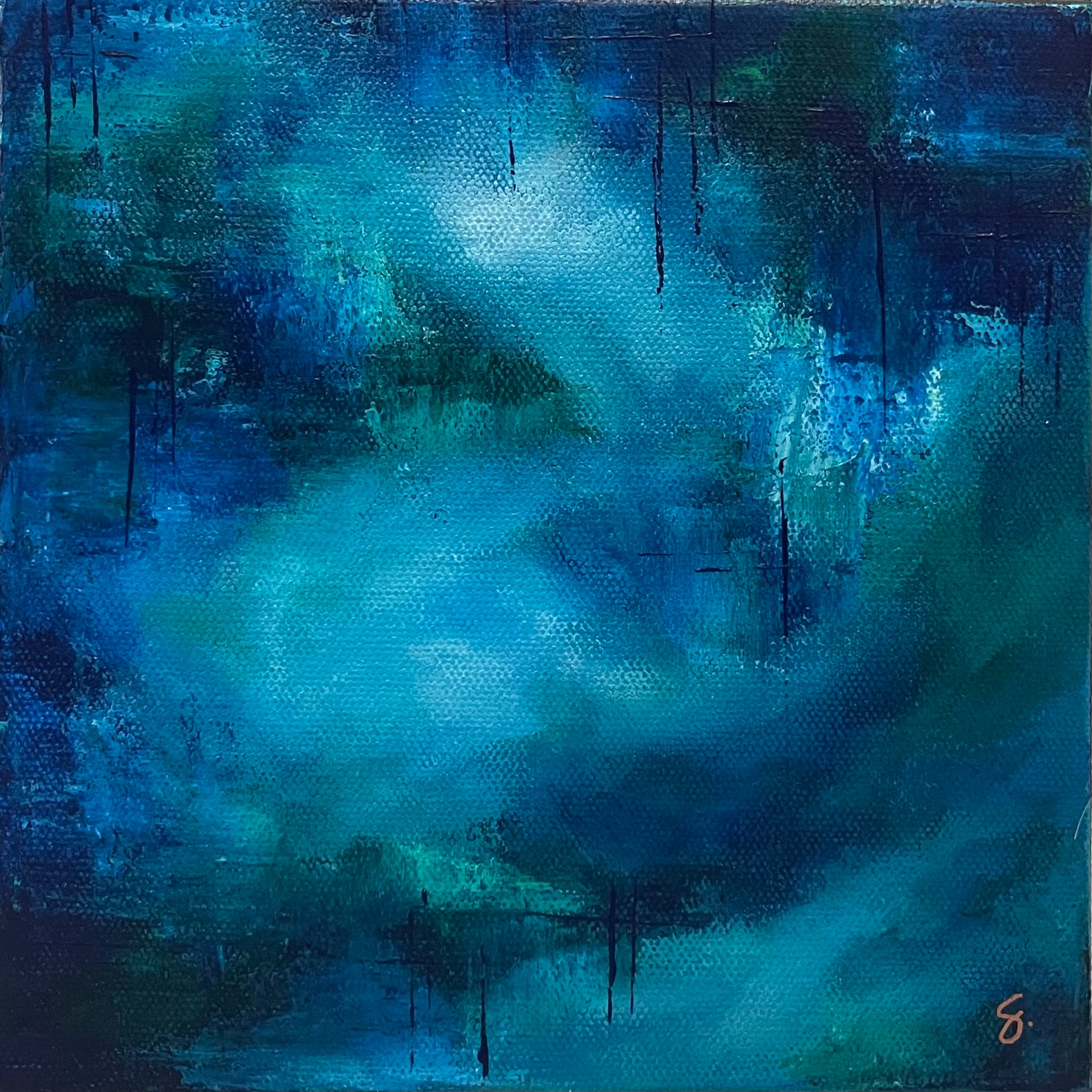 Imagine capturing the breathtaking dance of nature's elements within your living space—introducing "Monsoon," an 8" x 8" acrylic on canvas that promises to transform any room into a sanctuary of motion and depth. Immerse yourself in its rich, swirling tones of blue and green, each brushstroke a tribute to the beauty of summer storms in the Arizona desert. Intermittent vertical lines of darker paint invite closer inspection, adding texture and intrigue to this dynamic visual experience. By choosing "Monsoon," you embrace not just a piece of art but a vivid, evocative expression of nature’s splendor, making your art collection truly extraordinary.