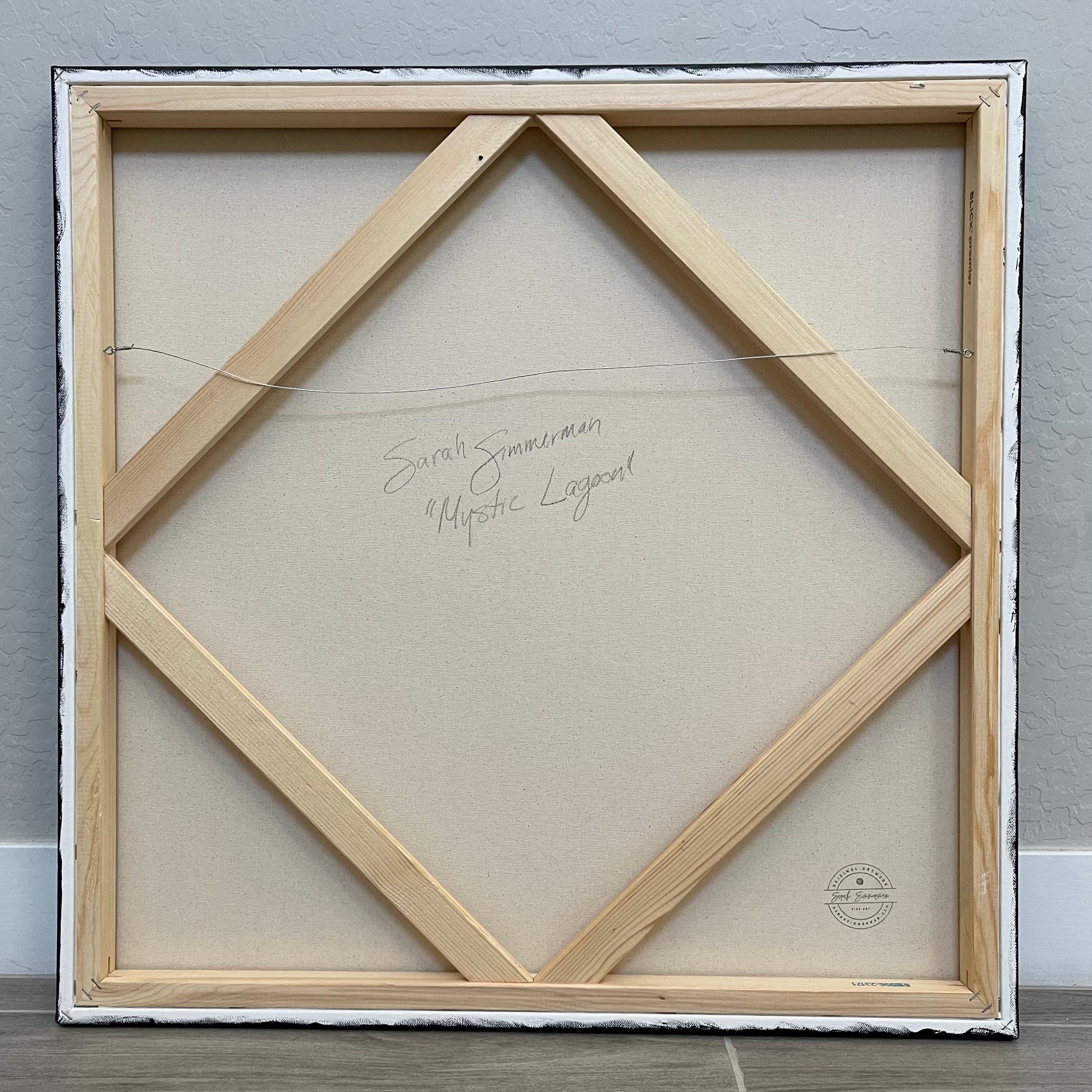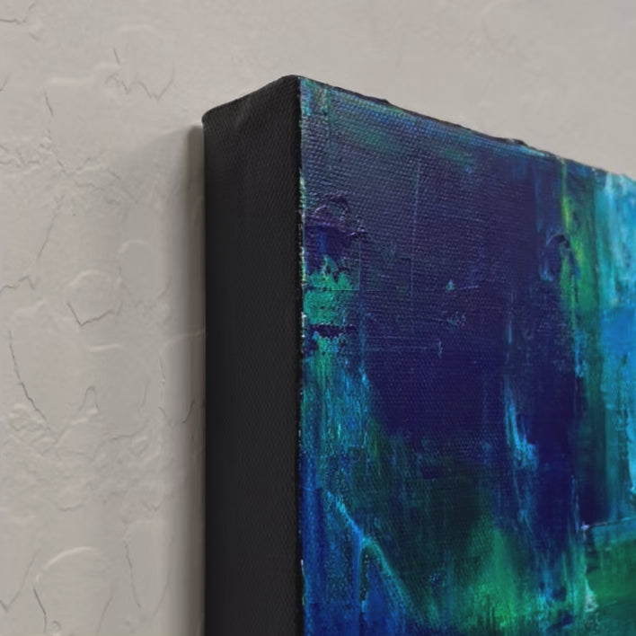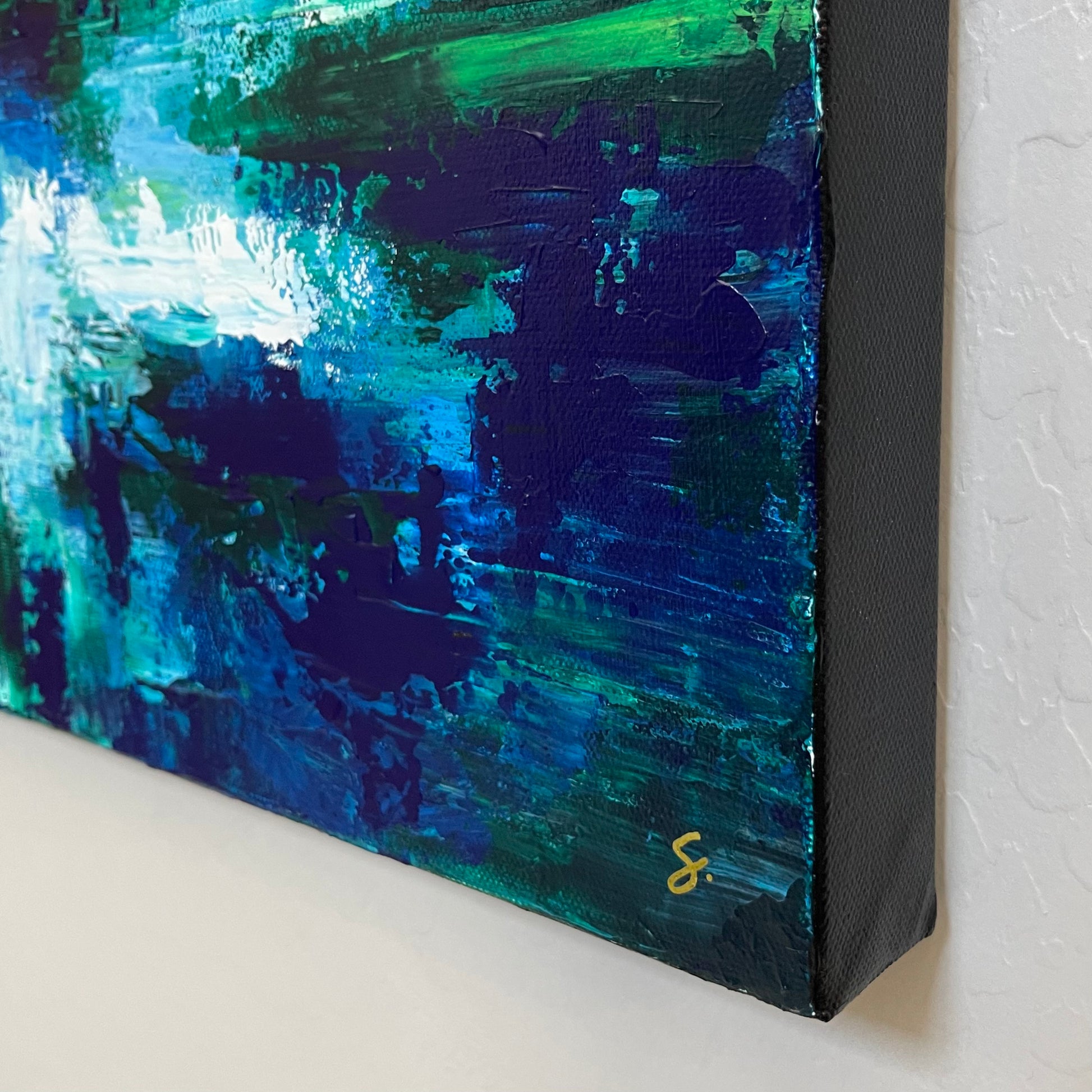 "Mystic Lagoon" is an abstract acrylic painting measuring 30" x 30", crafted to captivate your space with its rich palette of blues and greens. The dynamic, textured strokes suggest movement, creating a sense of depth that mimics light glinting off a watery surface. As you explore the painting, your eyes will dance with the interplay of light and dark shades, providing an organic, fluid quality across the canvas. This piece is more than just a visual experience; it encapsulates a serene, natural environment through its cool hues and impressionistic touches. It invites you to embark on a personal journey, finding your unique narrative within its vibrant dance of form and feeling. Imagine the painting as a pathway to self-discovery and healing, expressed through a silent language of color and texture. "Mystic Lagoon" is designed to resonate deeply with you, transforming your space into a tranquil sanctuary.