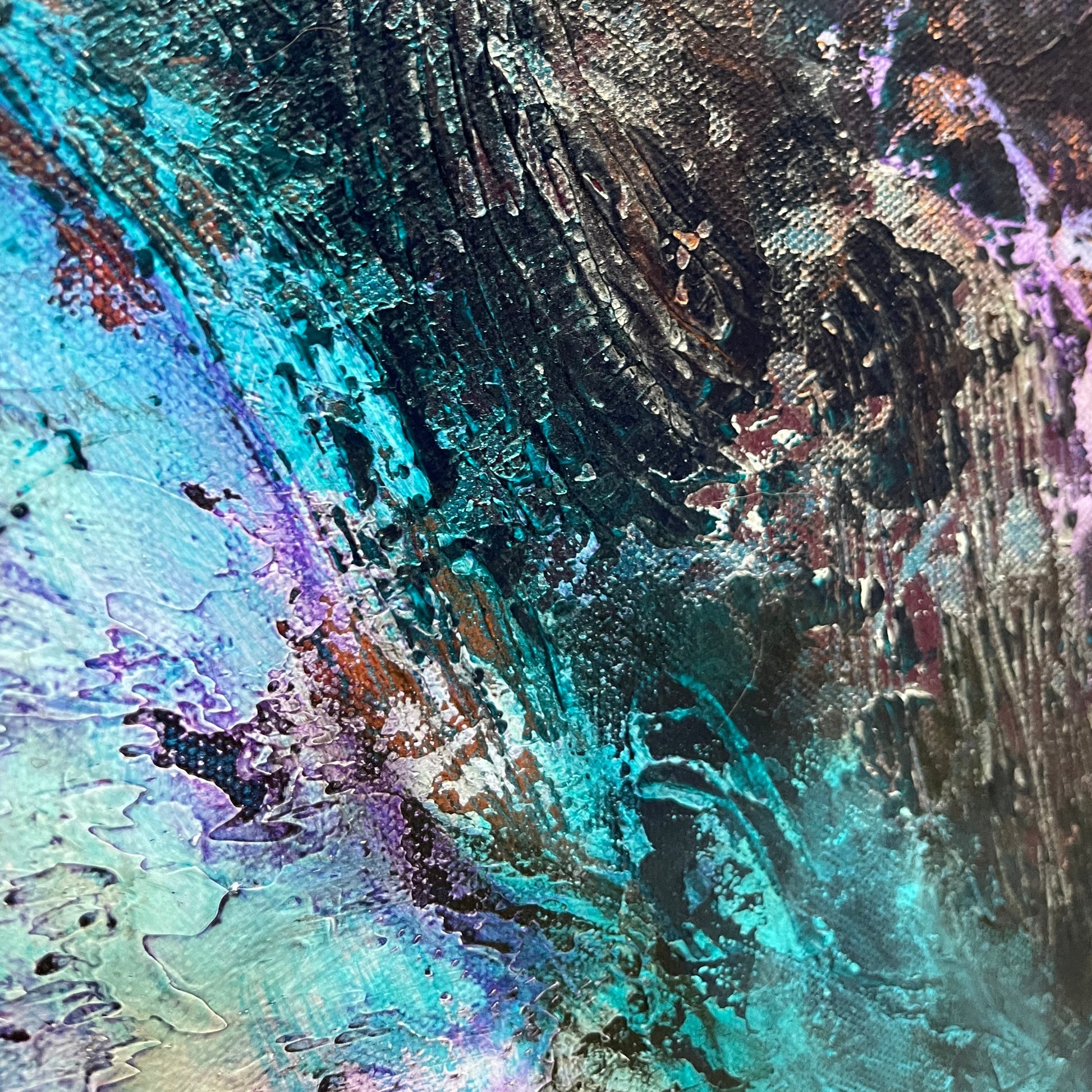 A deep, inky blue canvas serves as the backdrop for a mesmerizing interplay of colors. Striking hues of aqua blue, purple, white, and pale pink dance across the surface, creating a luminous contrast that draws the eye. The artist's bold brushstrokes and heavy impasto technique add depth and texture, inviting you to touch the canvas and feel the energy.