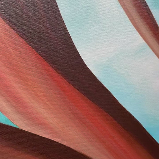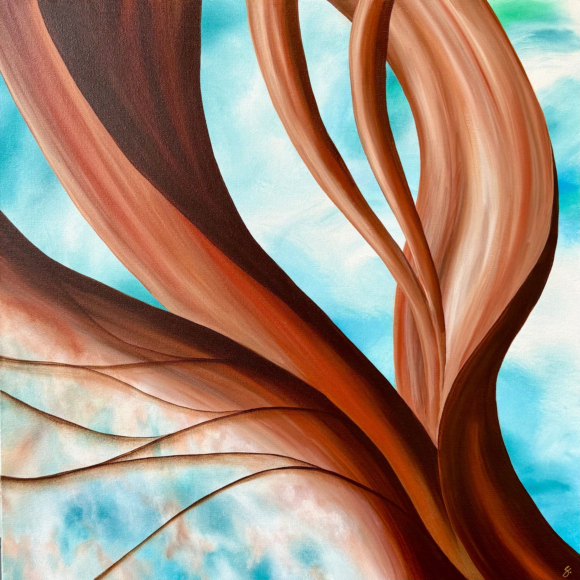 New Growth presents an abstract interplay of organic forms that evoke the quiet vitality of nature’s resurgence. Warm, earthy browns and rich reddish hues flow gracefully across the surface, their smooth curves rising against a backdrop of vibrant turquoise with hints of blue and green that conjure the open sky. The composition captures a sense of upward movement and gentle expansion, suggesting the emergence of new life and continual transformation. Thoughtful shading and subtle gradations add depth and dimension, allowing the shapes to feel both solid and fluid within the space. The contrast between the grounded warmth of the forms and the airy background creates a balanced tension that draws the viewer in, inviting reflection on growth and renewal inspired by the natural world.