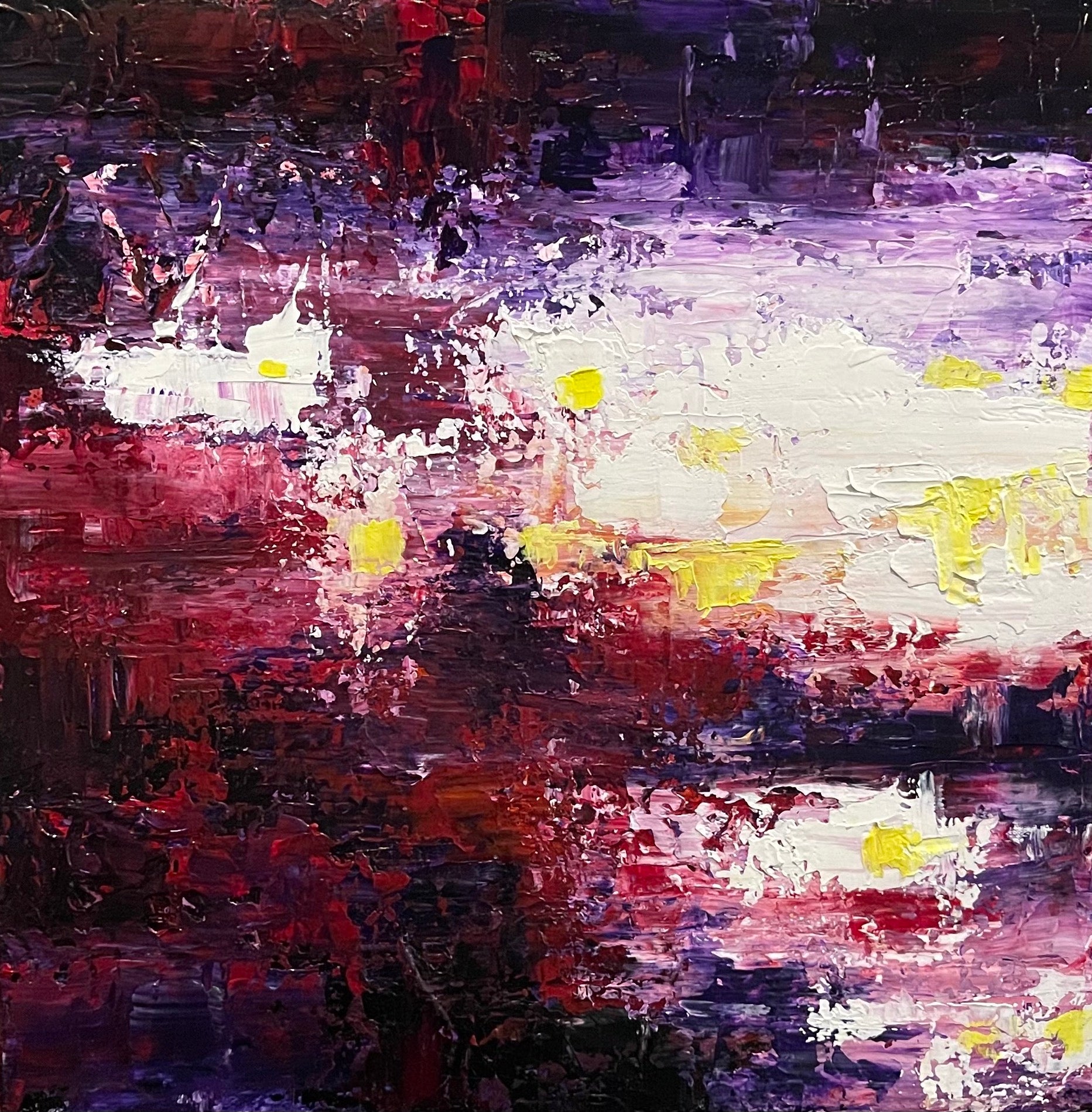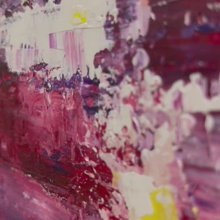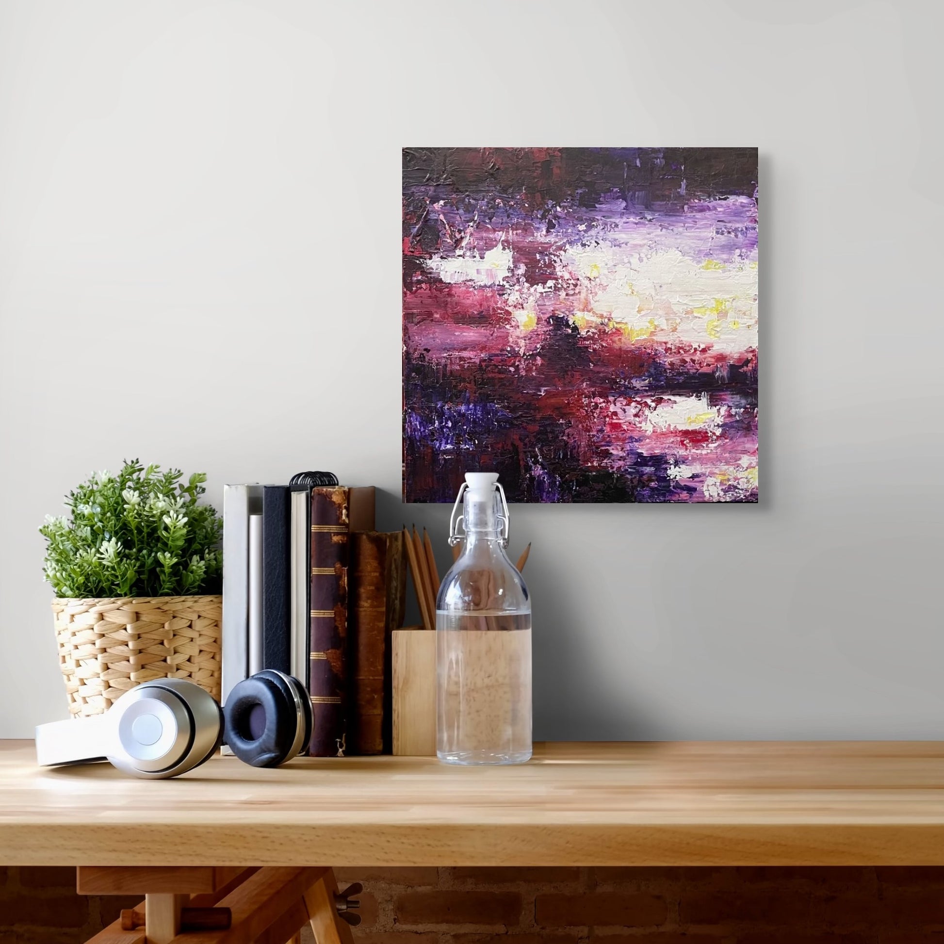 Owning "Passion's Dance" means bringing home a captivating 12" x 12" piece of abstract art that speaks directly to your vibrant spirit and discerning eye. The dynamic interplay of rich red tones, mysterious purples, and crisp whites, accentuated with bold touches of yellow, transforms your space into an energetic haven. The thick, textured impasto technique not only makes each brushstroke palpable but also adds a unique three-dimensional allure that stimulates both touch and sight. As the owner, you become the steward of its powerful warmth and opulent intrigue, inviting personal reflection and emotional engagement every time you—and your guests—look upon it. By choosing "Passion's Dance," you showcase your affinity for intense emotion and dynamic beauty, making it a striking centerpiece that echoes your own dynamic and passionate essence.