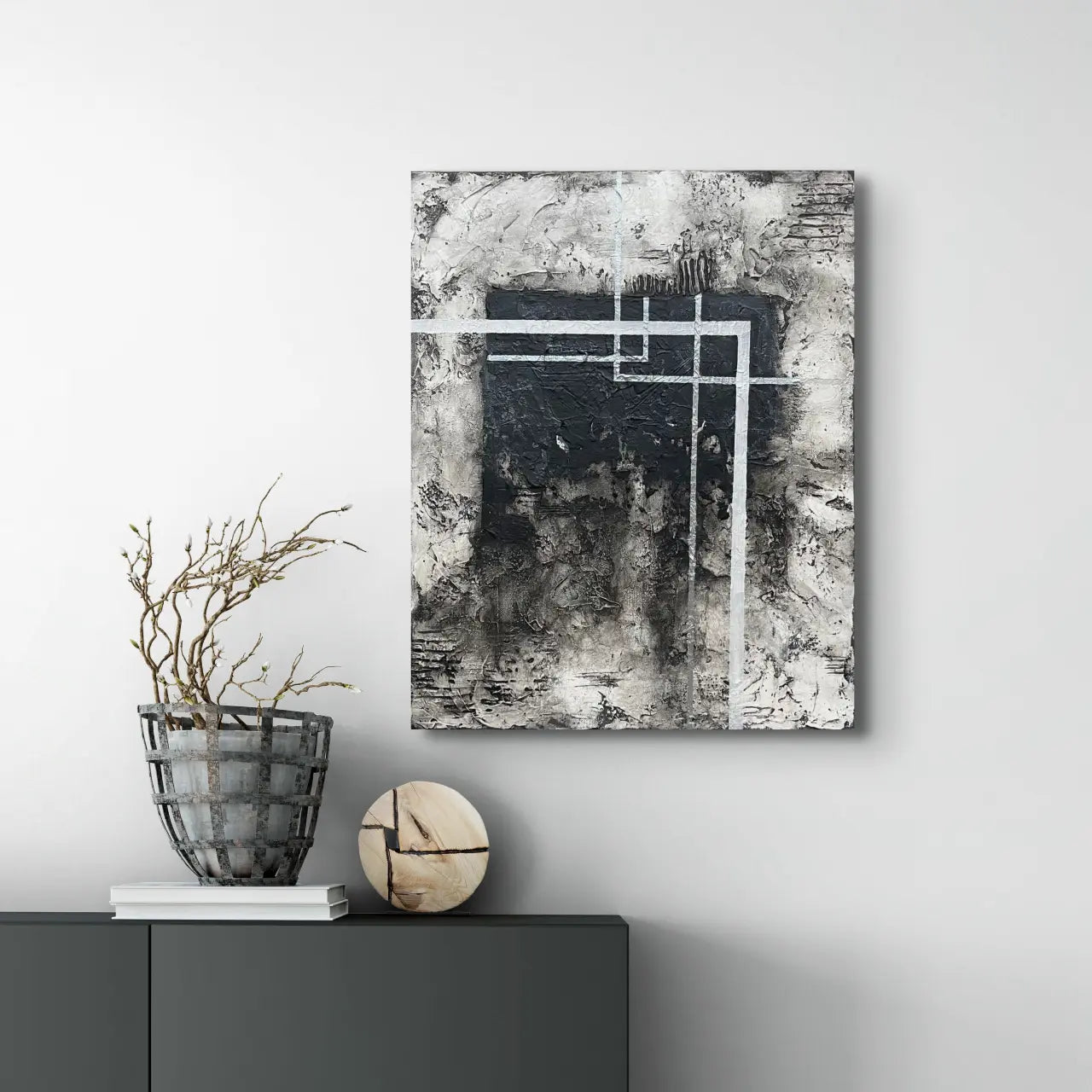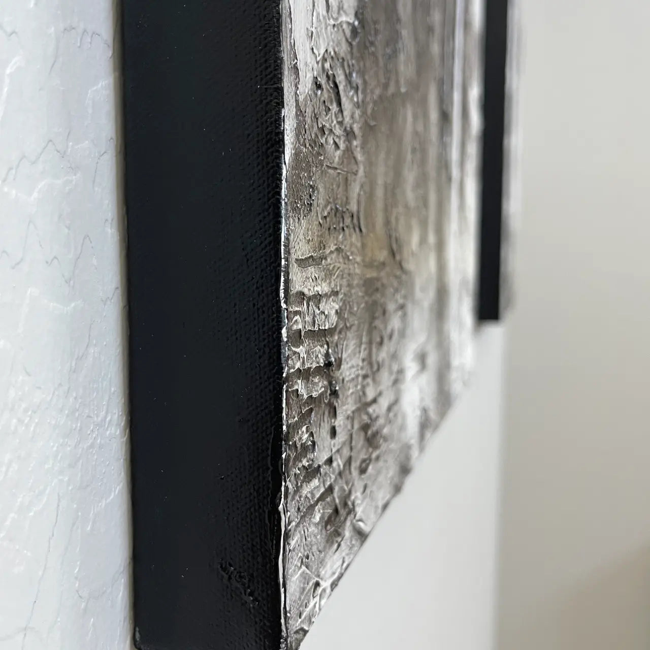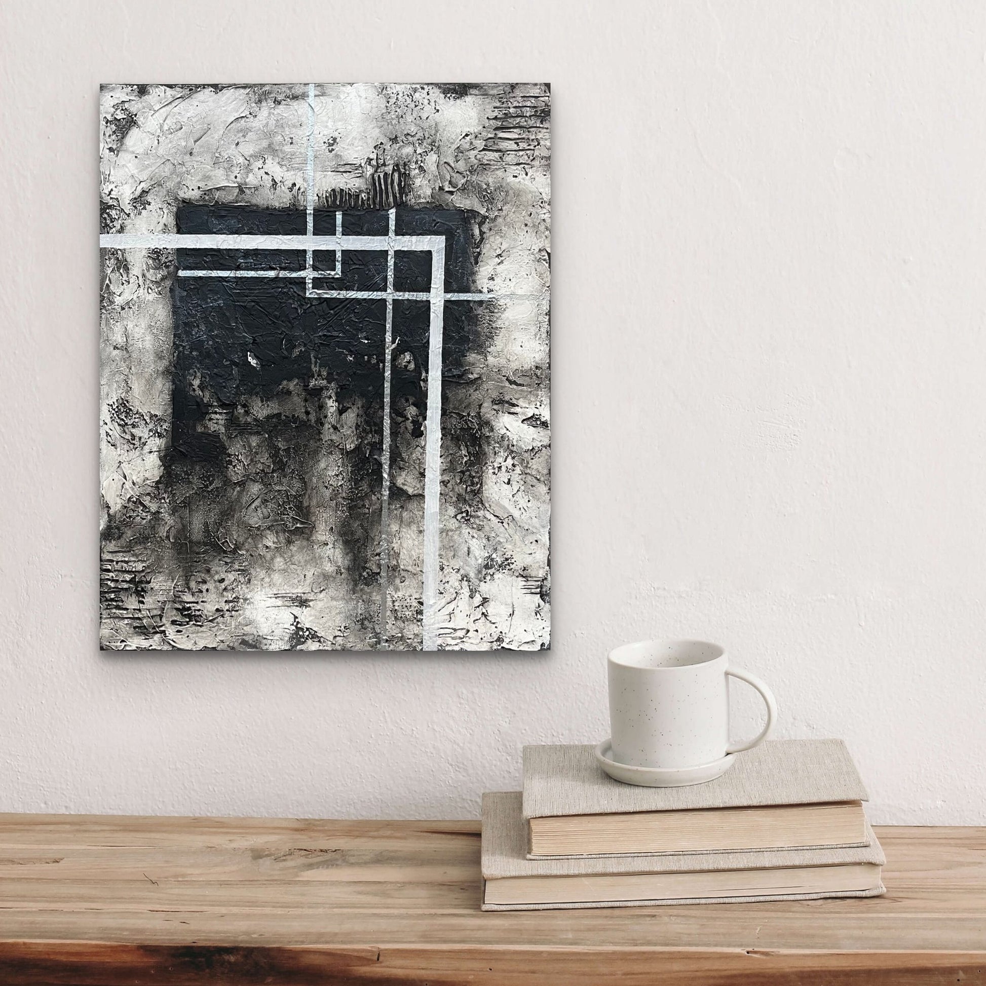The monochromatic palette of black, white, and grey creates a striking contrast, while the highly textured surface adds depth and complexity to the piece. The central motif, resembling a geometric form, is outlined by thick and thin lines in white and silver, standing out against the darker areas. The dynamic visual effect created by the variations in texture and brushwork gives the impression of controlled chaos, where structure and dissolution play against each other. Inspired by the artist's experiences with depression, anxiety, and burnout, the artwork is a powerful representation of strength and resilience in the face of life's difficult moments.