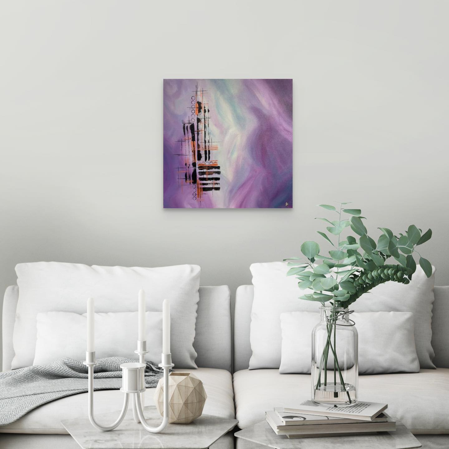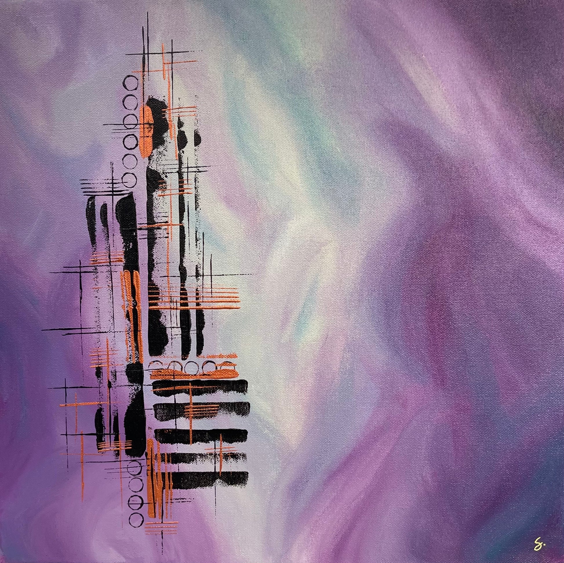 This abstract painting that features a blend of linear elements and color contrast to create a visual focal point amidst a diffused, atmospheric background. The background exhibits a soft integration of lavender, light purple, and hints of blue and teal, imitating a gentle swirling motion or a nebulous atmosphere, giving an overall impression of fluidity. The piece features an array of vertical and horizontal lines in black and copper hues, intersecting and overlaying in an almost architectural manner. This structural cluster gives a sense of depth and complexity, contrasting with the ethereal quality of the surrounding color field.
